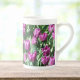 Desfrute de uma xícara de café, chá ou chocolate quente nesta caneca de porcelana bonito que apresenta a foto de enrolar de um jardim de primavera de bonito e roxas. Selecione também em outros estilos de caneca. Um design floral adorável!