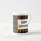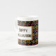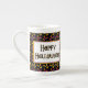 Uma caneca com padrão de Halloween de milho laranja, amarelo e doce roxo com Feliz Halloween em letras góticas em preto.