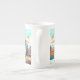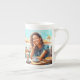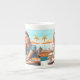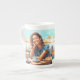 Garota sorridente com um café relaxante, cappuccino. Imagem artística para uma pausa relaxante e divertida, com um fundo marinho ensolarado.