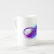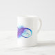 Símbolo infinito com uma bela pena pintada em cores roxas e azuis brilhantes sobre fundo branco.