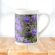 Desfrute de uma xícara de café, chá ou chocolate quente nesta caneca de porcelana bonito, que apresenta uma foto embrulhada de pequenas flores roxas de Rhododendron. Um design floral adorável!