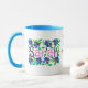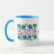 Uma caneca branca da "campainha" da boa qualidade com a borda e o punho do azul de pó. O design, parte dianteira e parte traseira, é uma colagem de papel pintado à mão das flores, folhas e a "Sarah conhecida" e o texto lêem in-between, "esta caneca pertencem a Sarah". Veja presentes, o cartão e o roupa igualmente de harmonização. Máquina de lavar louça e cofre forte do mictrowave.