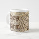 Este 20 oz. Uma caneca de tamanho grande tem um "Cozy Warm" escrito em caracteres castanhos de chocolate sobre a imagem de um suéter de malha de cabo. Um presente perfeito para você ou para qualquer bebedor de café. Há um campo de texto no verso que pode ser personalizado com um nome.