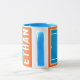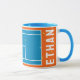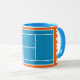 Caneca de presente criativa para jogador de tênis com bolas de tênis em uma quadra de tênis azul e laranja. Para personalizar, edite o texto para adicionar o nome dele ou dela.