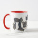 Caneca de café com vaca aquosa e trocadilho de vaca giro em preto, branco e vermelho.