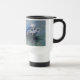 Uma caneca de viagem com uma tampa, que mantém aquecidas bebidas quentes e pára derramares. Conveniente para aqueles em movimento. Um tema costeiro com um pequeno barco no mar decora a caneca.