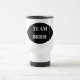 Esta Caneca de viagem de noiva da equipe é mostrada em branco com o texto da noiva. Você pode personalizar esta imagem adicionando nomes, datas ou alterar fontes e cores. Ou comprar como mostrado.