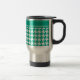 Uma Caneca de viagem não-derramar, com um padrão de verificação de som em Emerald Green. Há uma banda simples no topo do padrão que você pode personalizar com um nome ou algum texto - ou deixar vazio.