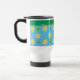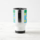 Uma Caneca de viagem Não-Derramar bonito para personalizar, com um padrão de Primroses e Bolinhas Verdes num fundo Azul Céu, agrupada com Bolinhas Amarelo e Branco; parte da coleção 'Primroses' Posh & Painterly.