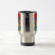 Uma Caneca de viagem para personalizar, com um padrão alegre de flores vermelhas, laranja e amarelas em um fundo turquesa brilhante, de uma colagem de papel pintada à mão por Judy Adamson.