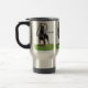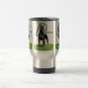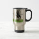 Um Pinscher preto do Doberman com o gráfico do nome da raça em uma caneca de viagem. Ou escolha uma caneca diferente serir suas necessidades.