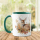 Esta caneca tem uma bonito imagem de outono de aquarela que apresenta um adorável cervo pintado que aparece entre as folhas de outono marrom e laranja. A imagem é impressa duas vezes na caneca, com seu nome ou monograma em marrom entre as imagens.