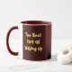 Um lindo Veado em um lindo pôr do sol agarra esta linda caneca de café desenhada com a palavra "A Melhor Parte de Acordar" nela.