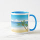Branco e azul claro 11 oz. uma caneca combinada com uma imagem de desenho de um dia perfeito em uma ilha desértica, com palmeira, cocos e o mar azul profundo. Ver pote de doces correspondente, xícara de café expresso, arremessador, placa de papel, vidro fotografado, bule de chá e portas copos. Veja toda a coleção de Potes de doces de naufrágio na COMIDA/BEV | Seção pratos.