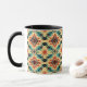 Nativo americano, a caneca design asteca apresenta um padrão geométrico de formas de diamante em turquesa, ferrugem e bronzeada. Ele é mostrado com um dentro preto e uma alça, no entanto há outros tipos de canecas disponíveis para escolher.