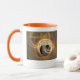 Esta caneca apresenta um design de coração de arte fractal em ouro e laranja em um fundo escuro. De um lado está a palavra "Grateful" e do outro lado está a palavra "Obrigado" escrita na escrita.
