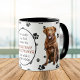 Um lindo Cachorro do Retriever da Baía Chesapeake fica em dois lados desta caneca. O texto entre as duas imagens diz "No dia 8, Deus criou o RETRIEVER CHESAPEAKE BAY e o chamou de MUITO BOM". As imagens do cão e o banner branco oval que contém os campos de texto são colocados sobre um fundo branco com impressões de pata preta.