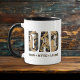 "PAI" diz esta caneca de café em verde e texto de padrão de camuflagem bronzeada. Abaixo do texto estilizado está "Man Myth Legend". A imagem é impressa duas vezes na caneca, com três campos de texto personalizados em preto entre eles. Perfeito para o Dia de os pais ou o aniversário dele!