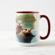 Uma família divertida de lontras gosta de um dia na água. Tetas bonitas e fofinhos nadando em um lago sereno. Tons felizes se divertindo em um cenário de floresta cênica. Uma imagem animadora de lontras se ligando na natureza. Aproveite uma xícara de café com esses adoráveis amigos da lontra.