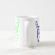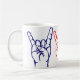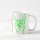 Três chifres do metal azuis, vermelhos, e verde na caneca branca