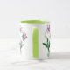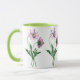 A aguarela roxa da antiguidade do cosmos em uma caneca cerâmica clássica com gren a borda e o punho verde.