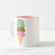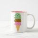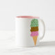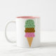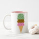 Características deste design um cone triplo do sorvete da colher (morango, pedaços de chocolate brancos do chocolate e pedaços de chocolate da hortelã) em uma luz - fundo azul.