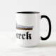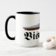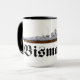 Caneca com desenho do famoso couraçado alemão Bismarck da segunda guerra mundial com o nome do navio escrito em letras fraktur.