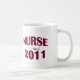 Em um lado desta caneca no texto curvado avermelhado-roxo corajoso lê: "ENFERMEIRA 2011". No meio deste texto no texto menor, customizável são as palavras "classe de". Dê a esta caneca um toque mais pessoal adicionando seu nome ou seu nome da escola ao lado oposto! Este design pode ser usado em algumas de um número canecas, vidros e de canecas de cerveja diferentes. Para todos os aqueles que trabalharão tão duro ser 2011 formandos da escola de cuidados.