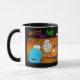 Agrida a caracterização de muitos monstro assustadores, uma mamã, uma abóbora assustador. A caneca tem o fundo preto e alaranjado com monstro e texto coloridos.