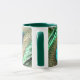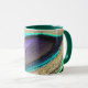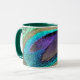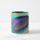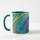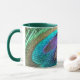 Esta caneca bonita é decorada por uma imagem de uma pena do pavão.