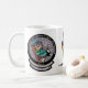 Planície, branco caneca de 15 onças com fraternidade internacional do logotipo naval dos engenheiros de vôo (IBNFE) em um lado e 'COMEÇOS PREFLIGHT APROPRIADOS COM CAFEÍNA" no outro lado, e o gajo do FE no centro.