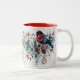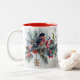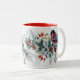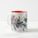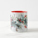 Os pássaros no pinho ramificam com bagas e cones do pinho em um fundo de madeira claro. Vitrificado para dentro no vermelho. Dê este presente do divertimento a um amigo, ou adicione-o a sua coleção do feriado. Construção, microonda e cofre forte fortes, cerâmicos da máquina de lavar louça.