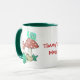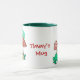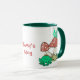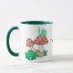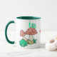 Caneca colorida dos trabalhos de arte dos desenhos animados das crianças, com um par cogumelos vermelhos silenciado, com um caracol do sapo verde e da cerceta. Personalize com nome da sua criança para um presente que especial todo o miúdo amaria.