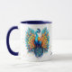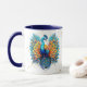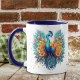 Esta caneca personalizada bonito apresenta um belo pássaro pavão fantástico em tons predominantes de azul e ouro. O pavão espalhou suas asas para mostrar o padrão colorido neles. A imagem é impressa duas vezes na caneca, com seu nome ou outro texto entre eles. Tudo é colocado sobre um fundo de splatter de confetti dourado.