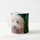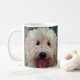 Labradoodle ou o Doodle dourado com fundo verde em t-shirt, canecas, botões, ímãs, chaveiro, camisetas de cão, cartões, porte postal, posters, roupa infantil, caçoam t-shirt, bonés, gravatas, a arte original etc. por Keleen