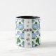 Caneca de café com tema de inverno com um padrão nórdico fofo de suéteres grossos, chapéus, mitenes, meias e flocos de neve escandinavos em tons de azul com sotaque verde. Personalize o nome no botão "Personalizar" fácil do Zazzle.