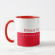 Uma caneca vermelha elegante e moderna, com linhas de texto editáveis...