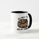 Esta caneca de café engraçada é perfeita para donos de cobra de animais de estimação. Ele apresenta uma ilustração de um cobra de píton de bola enrolada junto com o slogan: MY BALL ATEU MINHA OBRA DE CASA.