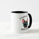 Esta engraçada caneca de café de cachorrinho francês faz o presente perfeito para amantes frênicos com senso de humor. A design apresenta uma ilustração ao estilo de desenho animado de um buldogue francês de cor castanha vestindo óculos de sol com a frase "Perdão meu francês." O design é o mesmo em ambos os lados da caneca.
