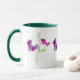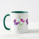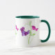 Uma caneca branca bonito da campainha com as ervilhas doces roxas e cor-de-rosa por todos os lados de uma pintura da aguarela por Judy Adamson. O punho e a borda são verde de caçador.
