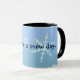 Flocos de neve em um fundo azul com escrita azul escuro.