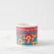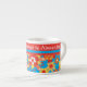 Uma caneca de café Espresso para personalizar com um padrão alegre de flores vermelhas, laranja e amarelas em um fundo turquesa brilhante, de uma colagem de papel pintada à mão por Judy Adamson.