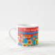 Uma caneca de café Espresso para personalizar com um padrão alegre de flores vermelhas, laranja e amarelas em um fundo turquesa brilhante, de uma colagem de papel pintada à mão por Judy Adamson.