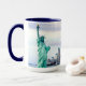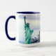 A estátua da Liberdade com o fundo do World Trade Center, marcas de Nova Iorque.