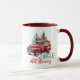 Esta ilustração de Natal ao estilo vintage tem um caminhão vermelho retrô, árvores verdes, e o texto Jingle All the way.
