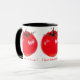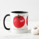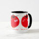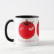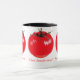 Esta Mug apresenta um design original com três tomate vermelho vivo em uma fileira no topo, e a frase "Eu amo sopa de tomate!" sob as fotos, em três línguas: francês, inglês e espanhol. O tomate na foto parece "eletrificado", com o caule verde e as folhas feitas de linhas de zigue-zague, e uma linha de ziguezague com destaque branco na pele vermelha brilhante de tomate. Estes tomates são vermelhos, e esta caneca é excelente para sopa de tomate.