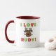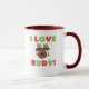 Cartões de saudação de renas, sacos de tote de renas e outros itens de feriado de renas com texto vermelho e verde que diz "I Love Rudy!".
