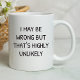 Eu posso estar errado, mas isso é muito pouco provável, caneca de café engraçada e sarcástica. Esta caneca de café sarcástica faz um presente perfeito. A caneca é impressa com a frase "Eu posso estar errado, mas isso é muito improvável" em uma letra arrojada e atraente. A caneca é feita de cerâmica de alta qualidade e é lavadora de louça e micro-ondas segura. É o presente perfeito para o amigo sarcástico, membro da família ou colega de trabalho na sua vida. Benefícios e recursos: - Disponível em caneca ou caneca de viagem cerâmica de 11 oz, 15 oz - lavadora de louça e micro-ondas seguras - impressão de alta qualidade - Texto engraçado e sarcástico - Faz um presente de excelente aniversário Ordene sua caneca de café hoje e comece a aproveitar seu café matinal com um sorriso! Para produtos semelhantes ou designs personalizados, visite https://www.zazzle.com/store/charnellescanvas ou entre em contato com o designer em charnellescanvas@gmail.com. #zazzlemade