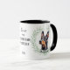 "LOVE MY DOBERMAN PINSCHER DOG" declares this mug for the proud Doberman owner. Each side of the mug has a beautiful portrait of a Dobie framed by soft green watercolor eucalyptus leaves. Between the two images is the text, which may be easily customized, or even removed by you, and your monogram or name.