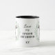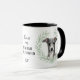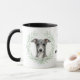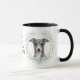 "LOVE MY ITALIAN GREYHOUND" declares this mug for the Italian Greyhound dog owner. Each side of the mug has a portrait of a gray and white Italian Greyhound framed by soft green watercolor eucalyptus leaves. Between the two images is the text, which may be easily customized, or even removed by you, and your monogram or name.